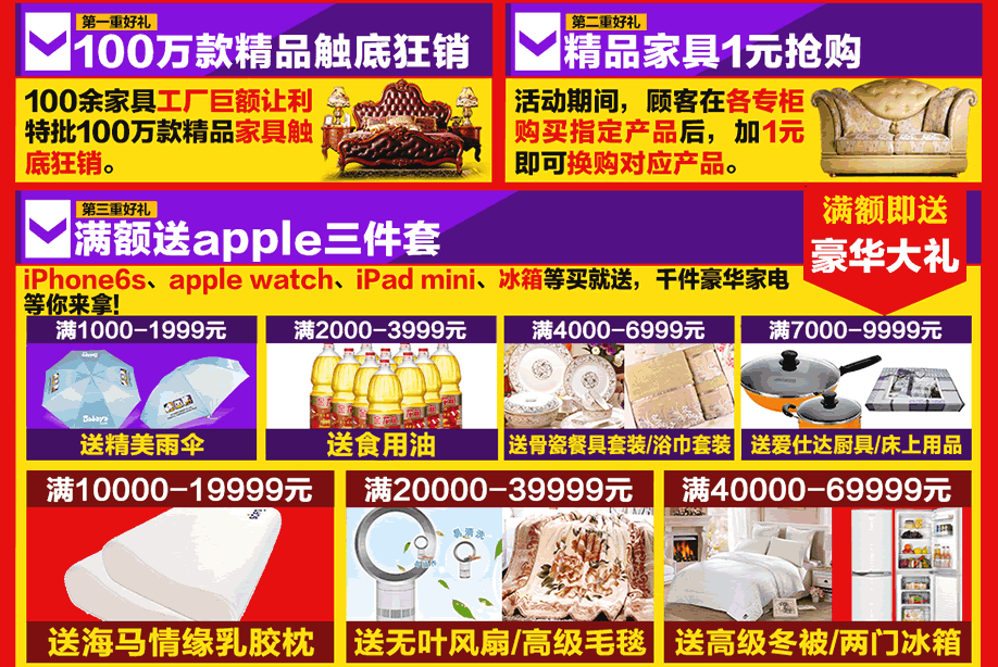 活动介绍: 10月24-25日,金海马家居(花都店)瀛富批发城联合100余一线品牌家具工厂,隆重举办“底价狂欢,惠不可挡”的大型促销活动。100余家具工厂巨额让利,100万款精品触底狂销,再享9大钜惠,打造全城家具促销最热高潮:来就免费抽泰国6天双人游;新收楼业主送餐具+千元现金券,网上报名提前锁定;消费满额送Apple三件套,掀起抢购热潮;下单再赢液晶电视、冰箱等,买家具送家电;还有精品家具1元限时限量抢购、0元拍卖、免费糕点......底价狂欢,豪礼不断!