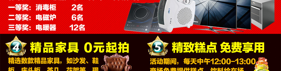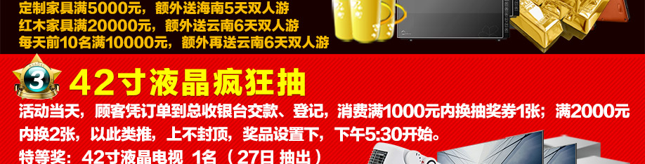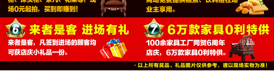 活动介绍: 羊城劲爆好消息,12月26-27日万盛名家家具博览中心6周年店庆,家具0利答谢会。没有什么事比店庆重要,万盛名家家具博览中心为广大业主谋福利来了,活动2天期间,全场家具极限让利,厂价特供,优惠多多,豪礼送不停,机不可失。抓住机遇,乐享不停;60根金条买满就送,满额送家电;下单再疯狂大抽奖:42寸液晶电视、消毒柜、电磁炉、电暖器......豪礼等你拿;到场签到还有精美礼品,6周年庆与您一起狂欢,马上报名参加活动,提前锁定优惠。