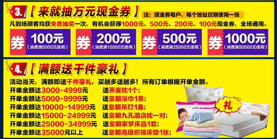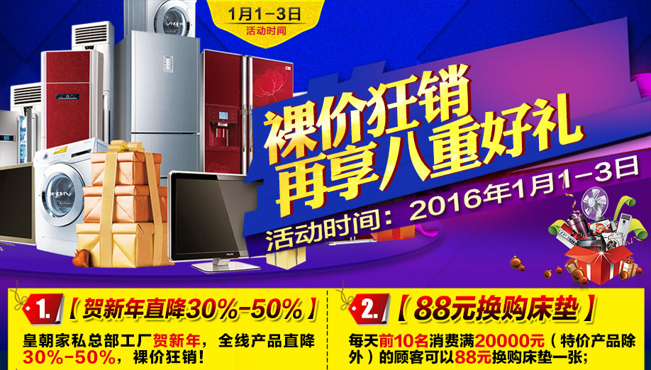 活动介绍: 新年新气象,新年新福利,新年新促销,新年新活动;1月1-3日皇朝家私工厂迎新大促裸价狂销,新的一年,打造全新的活动,买新的家具,过上美好的一年;组团直赴总部工厂,贺新年直降30%-50%,给业主们带来足够的新年大优惠,全场工厂直销,用最低的价格,抱最好的家具回家;来就抽现金券,新的一年,幸运女神一样会眷顾你们,自驾补贴油费,满额还可以返现2888元,满额再送高级床垫,好的活动就不容错过,马上报名参加活动,等着您!!!