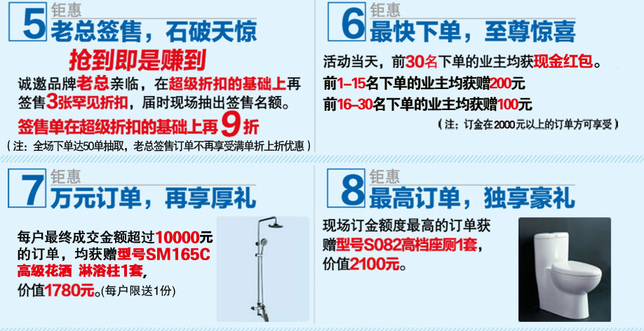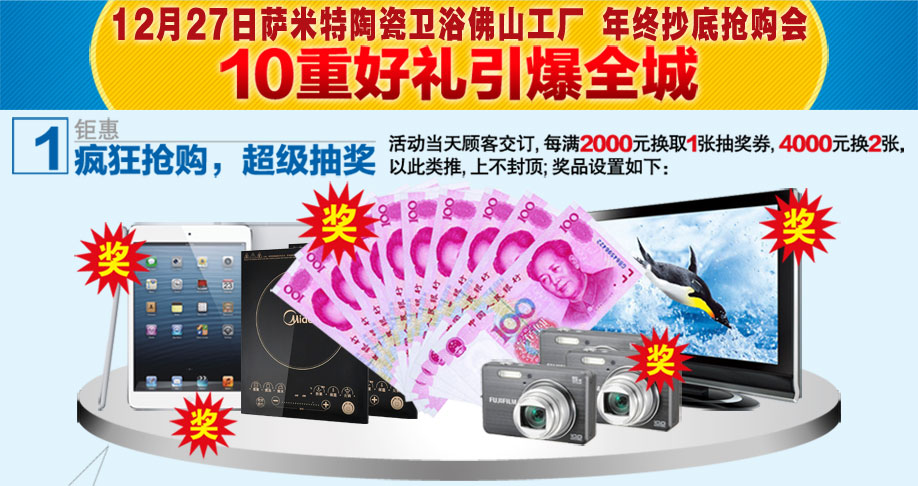 活动介绍: 好生活离不开好陶瓷卫浴,好陶瓷卫浴就属萨米特!年底将过,萨米特又掀起陶瓷卫浴采购狂潮,12月27日萨米特陶瓷卫浴佛山工厂 年终抄底抢购会,工厂直营,底价直销,开启终极盛宴!年终大促,1.5-4折,满单再折,低上再低,最快下单,还有红包惊喜,万元订单,再享厚礼!重重豪礼,惊喜不断,一元拍卖、满额返现、减免订金、iPad、名牌液晶电视...等您来!今年最后一场大型活动,不容错过,马上报名参加活动,提前锁定我们的优惠!!!