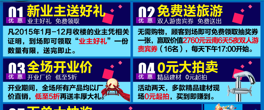 活动介绍: 1月1-2日雄峰城首届建材购物节暨灯饰馆启幕,200品牌联袂,百万优惠集结,超强震撼来袭。40万平方米的巨型场馆,容纳超多的产品,各类型产品齐全,选择多样性。优惠不断,满额+1元就可以换购精美的产品;来就免费抽云南游,来就有机会赢取;满额即抽全自动洗衣机,买越多送越好,买了不吃亏,买了不走宝;下单再抽豪礼,有40寸液晶电视、洗衣机、微波炉等豪礼。不要再犹豫了,马上报名参加我们的活动,提前锁定优惠。