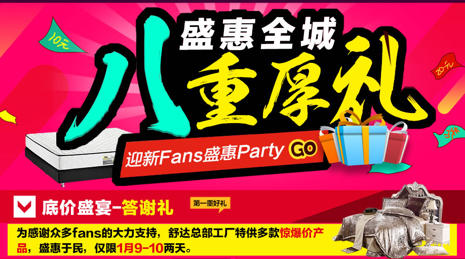 活动介绍: 好家具,就要买大品牌,睡得舒服,用得放心,那就一定要来深圳龙岗美国舒达床垫龙岗旗舰店。1月9-10日,美国舒达床垫龙岗旗舰店举行“迎新Fans盛惠Party”大型活动,备好豪礼:来就送200元现金券;套购折上95折;满额就抽红包,100%中奖,奖品有:现金、枕头、床品等,一月份生日顾客另有豪礼相送;超值大换购,含价值2460元乳胶枕一对;舒达一直以“制造世界第一流的床垫”为使命,为每个睡眠者提供完美的睡眠,质量无可挑剔,赶紧报名参加活动!