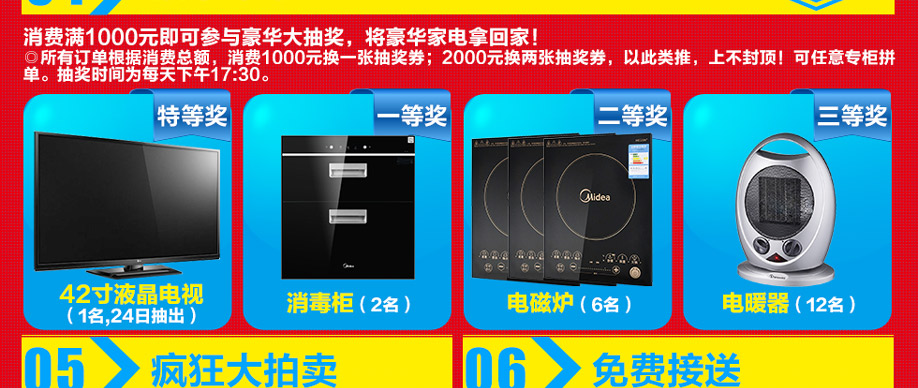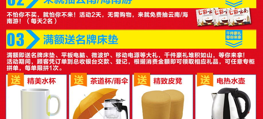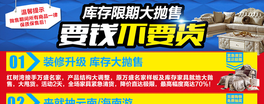 活动介绍: 家具业界大地震!1月23-24日红树湾接手万盛名家,装修升级 百万件家具放开价势,产品结构大调整,原万盛名家部分库存家具限期大减价抛售!全场家具成本价惠民;极限让价,邀您感受超级大减价的震撼!还有更有多重惊喜:来就免费抽云南/海南游,满额就送名牌床垫、平板电脑、微波炉等,还有豪华家电疯狂抽!1月23-24日,家具业界疯狂价,全城仅此一家,限万盛名家家具博览中心,清货期间所有商品一律保质保售后!马上报名参加吧!