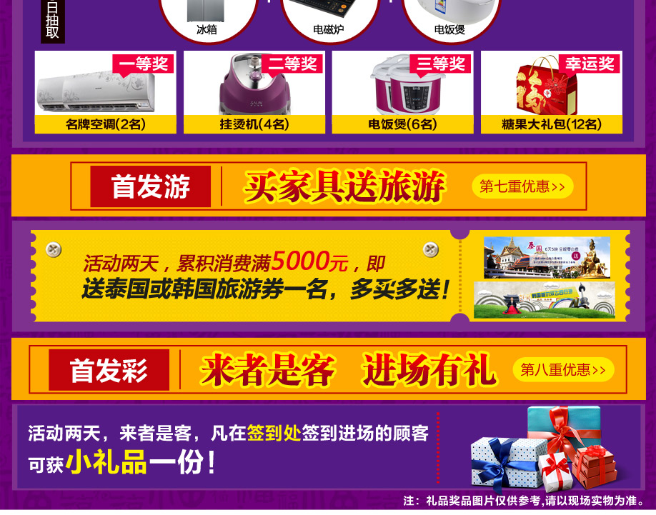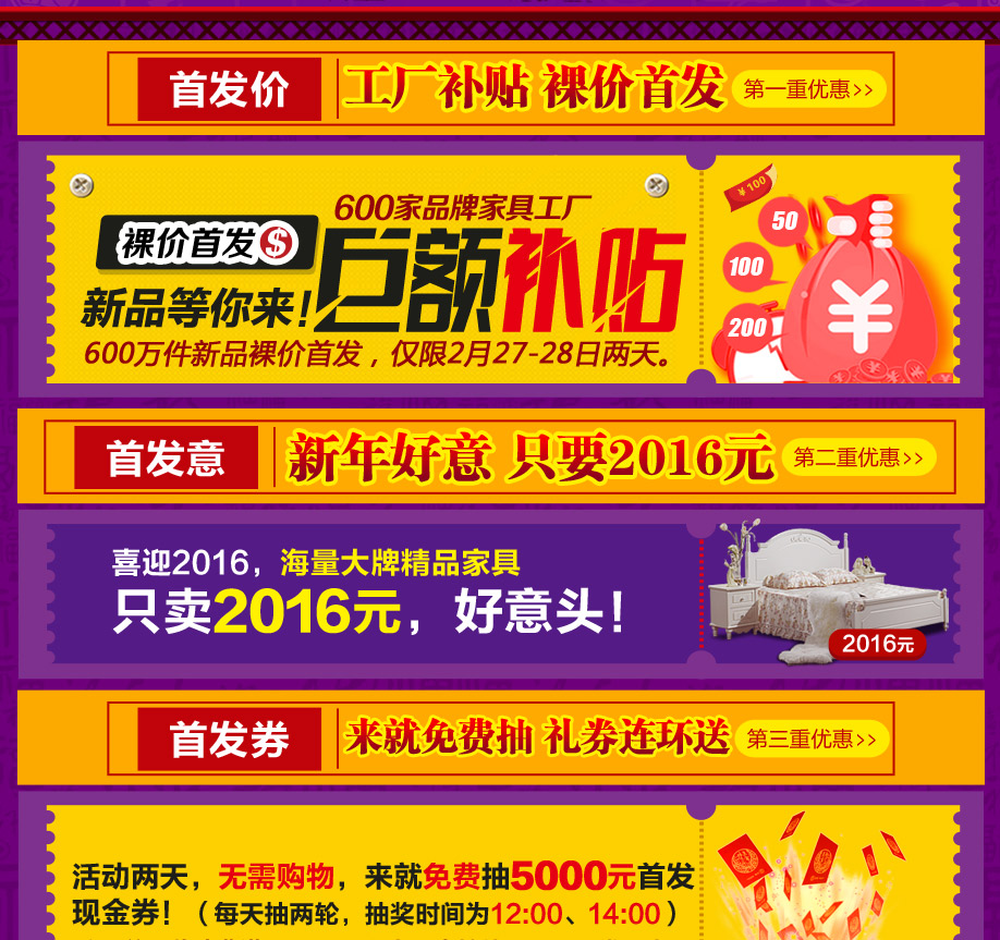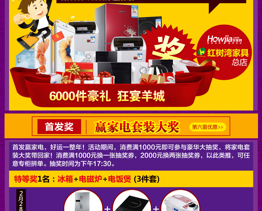 活动介绍: 好消息!实惠家与红树湾家具集团携手送大礼啦!2月27-28日“2016红树湾家具4店联动 家具首发惠”强势来袭,打响羊城家具开年第一炮!600家具品牌工厂鼎力支持,600万件家具裸价首发,6000件豪礼狂宴羊城!开年第一场家具钜惠盛典,要的就是震撼折扣,超级豪礼,来就免费抽现金券,满额就返现,最高返4999元现金,满额还有50寸液晶等你拿!还可以赢取家电套装大奖,买家具送旅游,赶紧在实惠家报名参与吧!