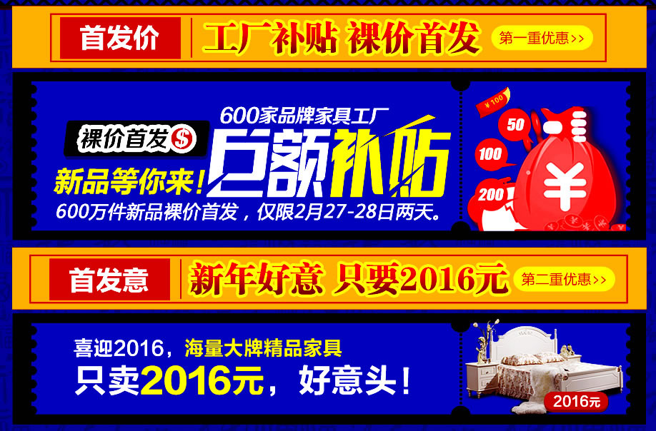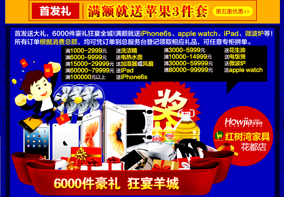 活动介绍: 好消息!实惠家与红树湾家具集团携手送大礼啦!2月27-28日“2016红树湾家具4店联动 家具首发惠”强势来袭,打响羊城家具开年第一炮!600家具品牌工厂鼎力支持,600万件家具裸价首发,6000件豪礼狂宴羊城!开年第一场家具钜惠盛典,要的就是震撼折扣,超级豪礼,来就免费抽现金券;海量大牌精品家具,只卖2016元;购物满额最高返4999元现金;满额再送iPone6s、Apple watch、iPad……还可以赢取家电套装+红包大奖,买家具送旅游,赶紧在实惠家报名参与吧!