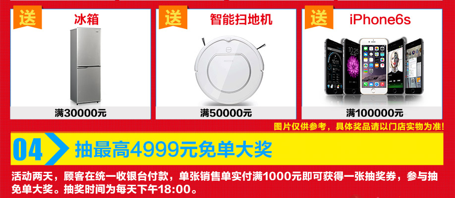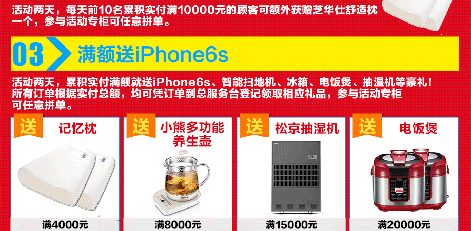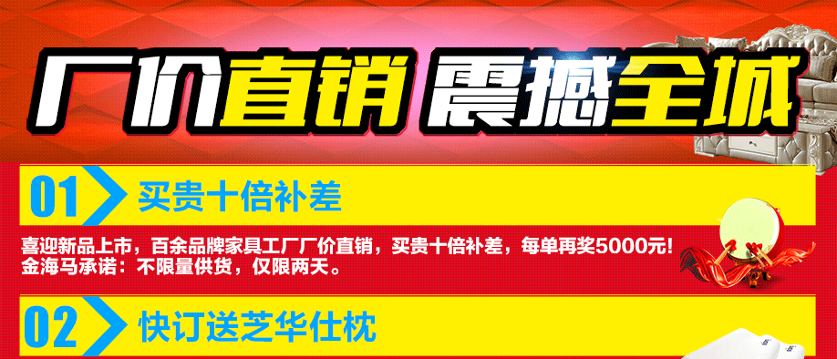 活动介绍: 羊城劲爆好消息,3月26-27日芳村金海马家居隆重举办“家具直销大典”活动,金海马家居芳村博览中心店为广大业主谋福利来了,活动2天期间,全场家具极限让利,厂价特供,优惠多多,豪礼送不停,机不可失。抓住机遇,乐享不停;满额送豪礼,送Iphone6s、智能扫地机、小冰箱......等大礼;购物再抽5万元免单大奖,最高4999元;满1万送芝华仕舒适枕;这么多豪礼等你拿;马上报名参加活动,提前锁定优惠!