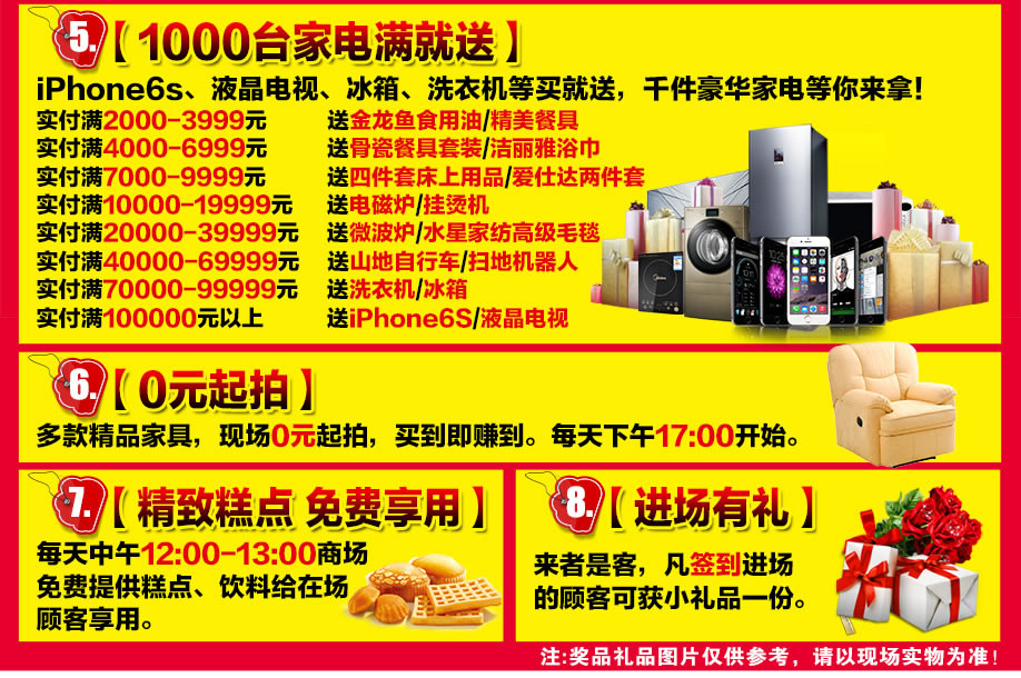 活动介绍: 4月2-3日实惠家与花都金海马家居携手隆重举行“品牌家具紧急清货特卖会”大型活动,商城升级改造,百家品牌工厂抄底价清仓清样,部分专柜调场装修,抄底清仓。活动仅此2天,签到进场好礼相送,中午爱心点心任吃;多款精品家具,现场0元起拍,买到即赚;来就抽现金/现金券红包;1000份新业主大礼包免费送;满额就送家电,有iPhone 6S、液晶电视、冰箱等,千件豪华家电等您来拿;更有万元终极大免单等着您!机会仅此一次,赶紧报名参加活动吧!