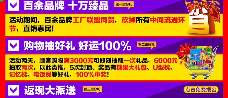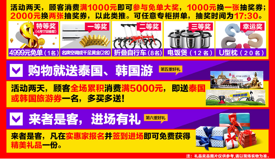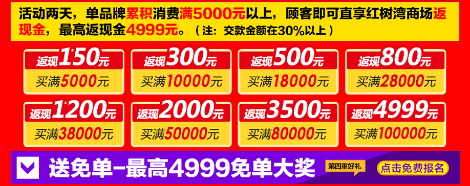 活动介绍: 羊城好消息,4月16-17日红树湾总店与实惠家强强联手,举行“家具聚实惠 抢免单”盛惠,百余品牌齐放价,精美家具裸价出击惠全城,百万款精品大惠民,全场前所未有超低价格,绝对超乎您的想象。活动两天,购物满额可抽千件好礼;买满返现金,最高返现4900元;购物还可以抽大奖,有惊喜4999元的免单奖,有名牌空调、自行车、电饭煲等礼品拿;购物送泰国或韩国游,多买多送;这么多豪礼大奖等你拿,你还在犹豫什么,别犹豫,赶紧报名锁定优惠吧。
