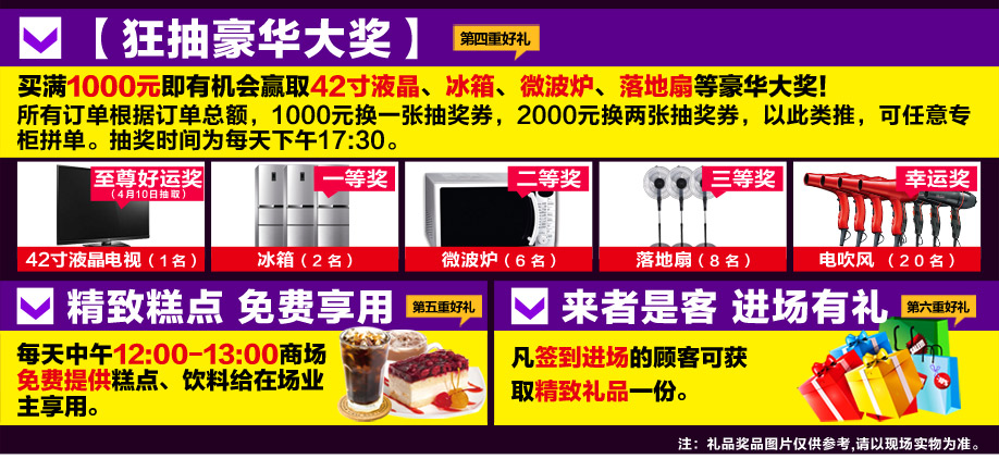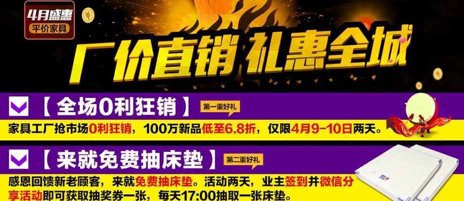活动介绍: 4月9-10日实惠家与涛天家具城携手隆重举行“家具0利狂销会”大型活动。全场平价出售,迎新品。自营0租金,比高端商场便宜20-30%,同样性质的家具,厂家直供,我们更便宜,便、靓、正,不要走宝,看上就拿走。家具工厂抢市场0利狂销,100万新品低至6.8折,活动仅此2天。无需购物,来就抽床垫;满额就送全屋家电,下单即有机会赢取豪华大奖,42寸液晶电视、空调、冰箱、洗衣机、微波炉、饮水机等千件好礼您来拿!机会仅此一次,赶紧报名参加活动吧!