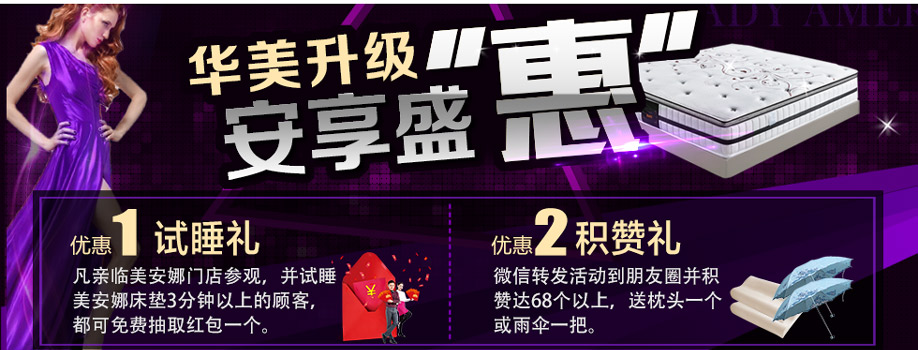 活动介绍: 4月30-5月2日,来自美国的领导品牌-Lady Americana美安娜床垫“盛大开业”!美安娜床垫始终坚持卓越的品质和完美的睡眠体验,是国际睡眠行业乳胶寝具领军品牌、世界众多顶级酒店供应商,国际床垫全球销量前十的领导品牌之一。本次华美升级,安享盛“惠”,让您在体验奢华品质的同时感受“舒适及物超所值”。五一假期3天,实惠家与Lady Americana美安娜床垫诚邀您亲临品鉴!