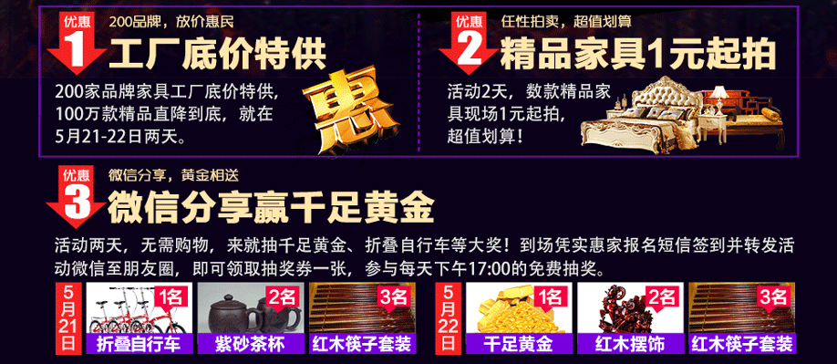 活动介绍: 羊城五月,家具顶峰钜惠来袭!5月21-22日,红树湾家具博览中心总店(中山大道东)与实惠家携手举办“家具超级放价日”的大型家具促销活动。此次活动优惠力度登顶,名品荟萃,200品牌工厂底价特供,100万款家具直降到底,震撼羊城!微信分享即可免费抽千足黄金、自行车等大奖,满额送全屋家电,还有多款精品家具1元起拍,买家具还有豪华大奖:抽50寸液晶电视、空调等。实惠家与红树湾总店现诚邀您亲临品鉴,感受超级大减价的终极震撼!