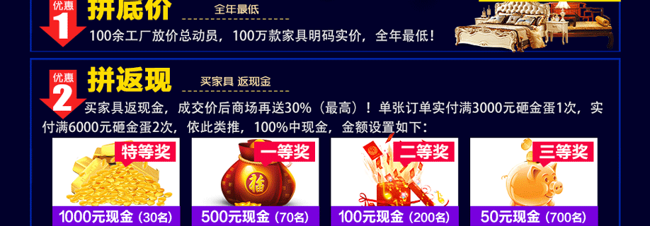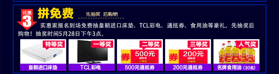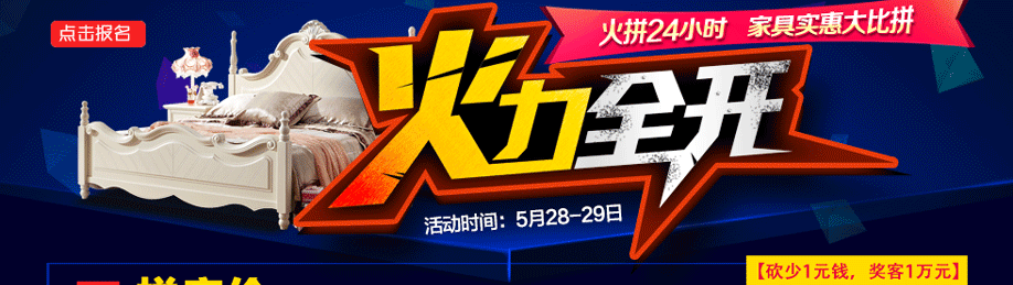 活动介绍: 100家工厂放价总动员,100万款家具钜惠来袭!5月28-29日实惠家联手博皇家具博览中心芳村店掀起“家具血拼24小时 全城疯抢”的低价浪潮,彻底演绎0利抢购风暴。本次活动,品牌荟萃,涵盖了沙发、软床、实木、红木、欧韩、定制等全类别家具,应有尽有,一站购齐!全场家具极限让利,均以厂价直销,让您省钱到底!活动期间,来就免费抽皇朝进口床垫、TCL彩电;新业主送大桶名牌花生油;购物满额最高返现30%,再送泰国6天5夜豪华双人游!实惠家报名享本次活动所有优惠。