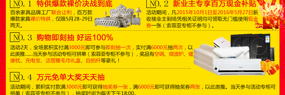 活动介绍: 钜惠来袭啦!5月28-29日香江家居·旗舰店与实惠家强强联手举办“决战大免单”的大型家具惠民活动。本次活动汇集一百多个家具工厂品牌,百万爆款裸价特供,全场品牌家具以最低价出售,惠赠于民,活动两天,新收楼业主专享百万返现补贴,买家具满额即抽家电:1.5匹格力变频空调,格兰仕微波炉等,还可以抽万元免单,一不小心,免单大奖就是你的啦。这么好免单机会不是经常有哦,别犹豫,赶紧来报名锁定优惠吧!
