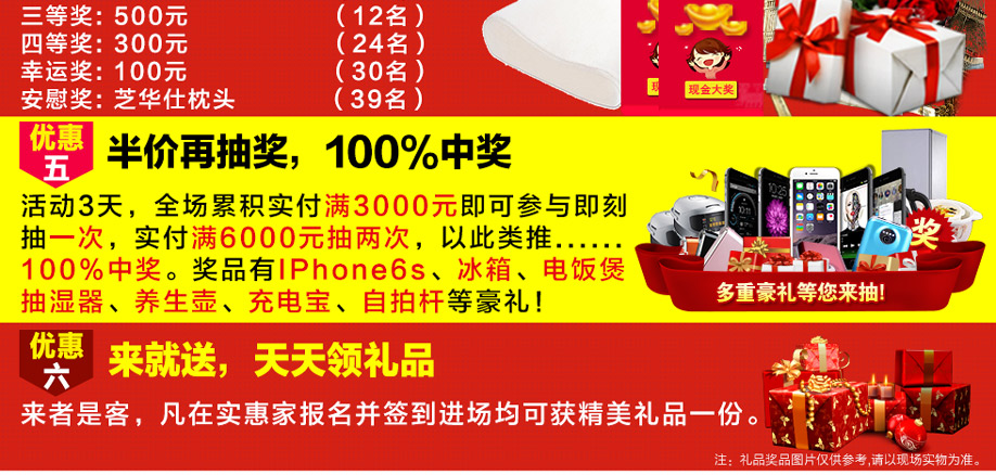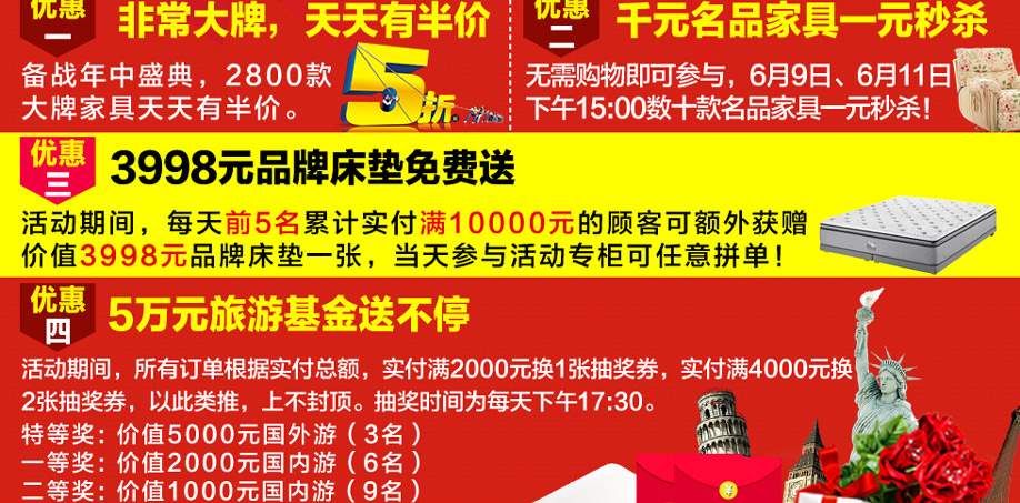 活动介绍: 6月9-11日,“家具半价日”连续三天价动端午,百个家具品牌总部特许让利,6月挑战工厂价,所有产品价格一降到底,全城疯抢!活动期间,汇聚高中低三个档次,家具类别齐全,网罗百余时尚环保品牌,集结千款特价精品,囊括万件新品家具。更有专属实惠家业主的福利:价值3998元床垫免费送,家具半价再送千件好礼,狂抽万元旅游基金,名品家具一元秒杀!大牌放大价,钜惠贺端午!提前报名锁定本次活动优惠,实惠家与芳村金海马居诚邀您一起价动端午,共享半价日!