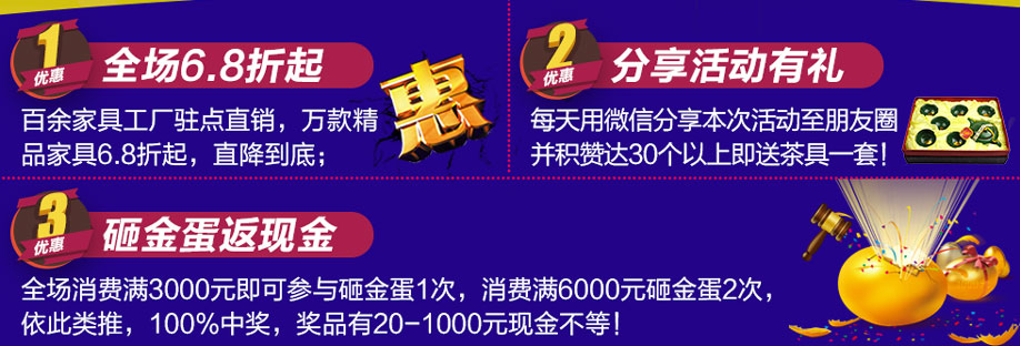 活动介绍: 拼速度!抢平价!砸金蛋!6月18-19日,涛天家具城 “平价家具抢购会”,精彩万分等您来!万款精品家具6.8折起,比高端商场便宜20-30%,一站式购物省钱到底。家具工厂抢市场0利狂销,本着产品质量高、购物优惠多、售后服务好的原则,打造平价工厂销售平台!购物返现,满额就送42寸液晶、电冰箱、洗衣机、消毒柜、微波炉等全屋家电!活动期间,平价特供,不予议价,预购从速,活动优惠仅在6月18-19日!报名参与本次活动,迅速抢购,尽享平价!