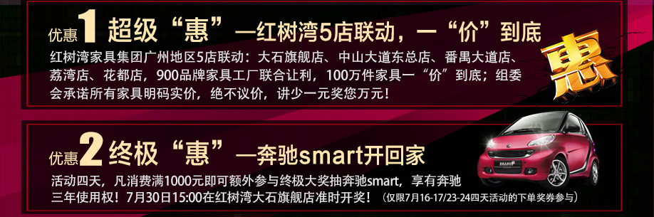 活动介绍: 7月16-17/23-24日红树湾首届家博会,首创广州地区大型连锁家具商场5店联动、疯抢4天,覆盖全广州所有业主,活动规模刷新行业记录;900家行业领先品牌工厂鼎力支持,所有类别家具一应俱全;100万爆款家具涵盖高中低三个档次,全场家具明码实价,直降到底;4999元免单、送全屋家电、8元换购、1元拍卖、免费送百辆自行车……还有奔驰终极大奖,劲爆来袭;赶紧报名免费参与本次家博会,享所有优惠环节!