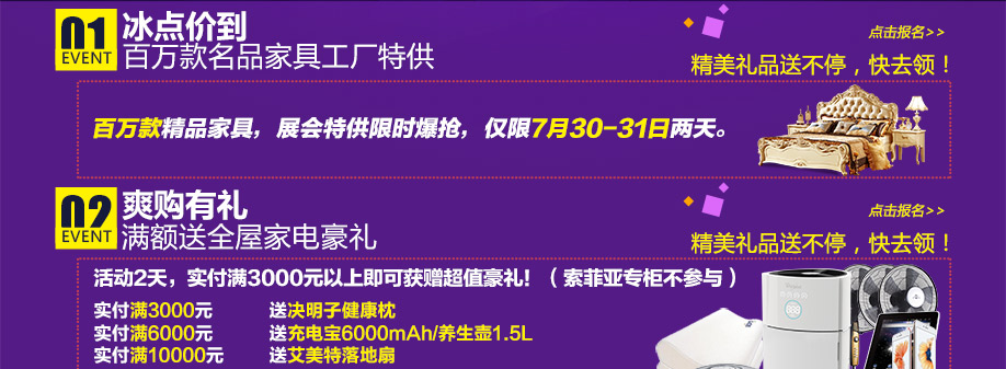 活动介绍: 7月30-31日“工厂直销日”大型的促销活动,将于香江家居广州大道中旗舰店如期举行。本次活动,汇聚了一万多款名品家具,涵盖了板式、沙发、睡眠、欧式、实木、红木、定制等多种类别,产品均由工厂提供,冰点价到,将实惠进行到底!活动期间,购物可享多重优惠:4999元现金大抽奖;满额送全屋家电豪礼,奖品有Iphone6s(16G)、iPad Air2 (16G)、飞利浦空气净化器等;现金红包限时送,高达688元。多重优惠,让你买家具省钱到底!于实惠家报名,提前锁定所有活动优惠。