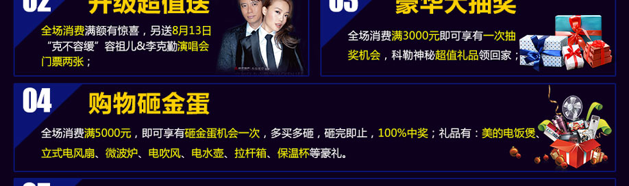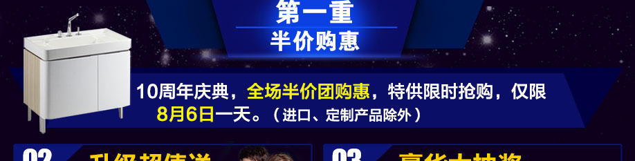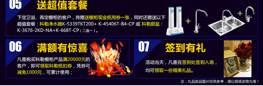 活动介绍: 8月6日科勒旗舰店10周年庆典,半价狂欢,全场万款名牌卫浴、橱柜特供,爆款单品+超值套餐抢不停,巨爆优惠,底价惠民,实惠多多。消费满额,额外送8.13“克不容缓”容祖儿&李克勤演唱会门票;还有满额即可享有砸金蛋机会,多买多砸,砸完即止,100%中奖;礼品有:美的电饭煲、立式电风扇、微波炉、电吹风等,就此1天,优惠于业主,全城最低,不要再犹豫了,有需要的业主就马上报名参加活动!!!