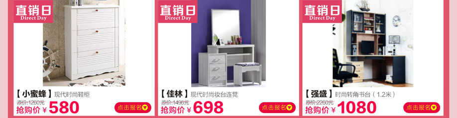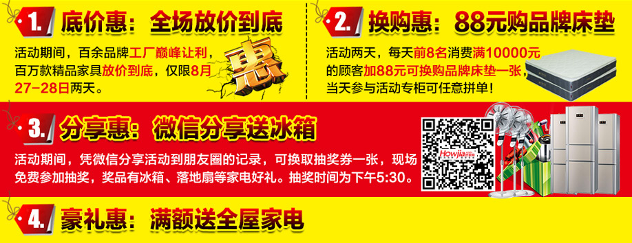 活动介绍: 8月27-28日,中桥家具广场举办以“家具工厂直销日”为主题的大型家具促销活动。活动期间,百个品牌工厂巅峰让利,百万款家具放价到底!全场家具质量保障,均以厂价直销,让您花更少的钱买到最实惠的家具,还可尊享九重钜惠:满额送空调、洗衣机等全屋家电;购物送泰国六天五晚游;88元换购品牌床垫;狂抽50寸液晶、冰箱、微波炉等家电大礼……物超所值,让您省钱到底!于实惠家报名免费参与活动,享受活动所有优惠。