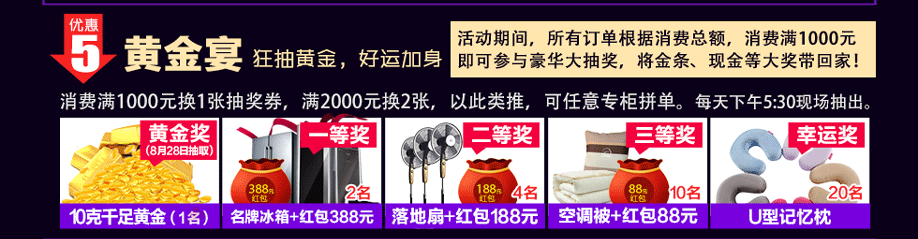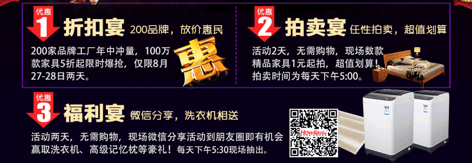 活动介绍: 家具黄金宴,黄金疯狂送!8月27-28日红树湾中山大道东总店给你精彩不间断!活动2天,汇集行业各大顶尖品牌,100万款精品家具,5折起限时抢购;冰凉价格要你完胜高温!来就抽洗衣机!买家具就送豪礼,冰箱、洗衣机、50寸液晶电视等全屋家电送给你;清爽大礼要你嗨翻夏天!还有千足黄金超级大抽奖;幸运加倍要你乐享生活!8月27-28日,红树湾中山大道东总店,豪礼狂砸,所向披靡!精彩限此2天,赶紧报名,锁定活动优惠折扣,畅享家具黄金盛宴!
