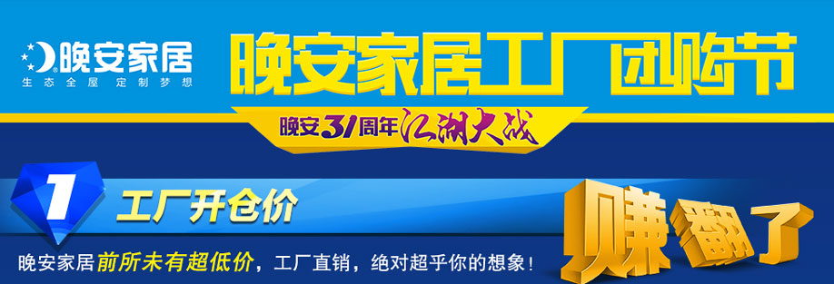 活动介绍: 9月11日,实惠家与晚安家居强强联手举办“工厂团购节”的大型家具促销活动!一万平方米工厂展厅,厂价特供,仅此一天。晚安31周年,巅峰价格战,直击出厂价,晚安家居前所未有超低价格,绝对超乎您的想象。活动期间,到场即可抽现金券;满额还可以抽红包;下订砸金蛋,100%中奖,奖品有:高档床垫、微波炉、记忆枕等;更多优质产品以抄底价呈现,省心更省钱,只需超低价就可以领走。于实惠家免费报名参加本活动,尽享活动所有优惠。