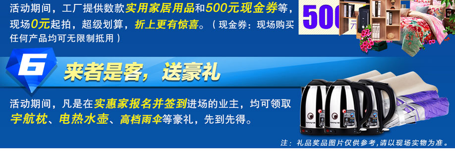 特别提示:应举办方规定,实惠家是本次活动唯一指定报名登记渠道,所有参与业主须在本页面(顶部)报名,方可享受活动的所有优惠,活动前会有客服致电告之详情。查询报名成功与否可致电13728114491→
