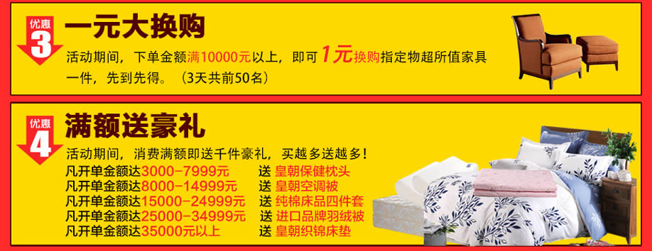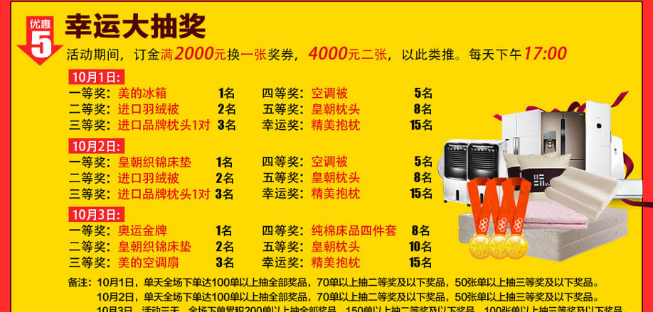 活动介绍: 十一国庆大放价,喜迎国庆,举国狂欢,为此10月1-3日实惠家与皇朝家私举办“万人抢购会”大型活动共同庆祝国庆。总部工厂为迎接本次峰惠,总裁特批,工厂开仓,全场所有商品直降30-50%,全年仅此一次。活动当天,满额即送千件豪礼,买越多送越多!大单返现金2888元,更有大抽奖,奖品有:奥运金牌、美的冰箱、皇朝织锦床垫等豪礼。好礼拿不停,价格更实惠。买到就是赚到了,赶紧来实惠家报名锁定优惠吧!