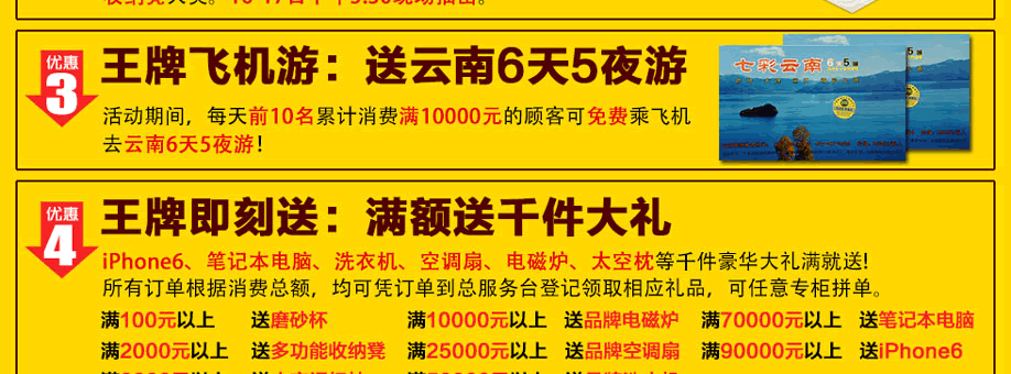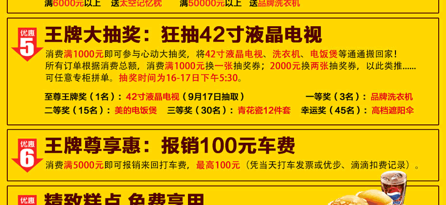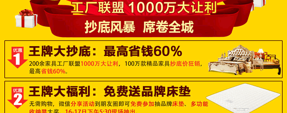活动介绍: 9月15-17日,南岗光辉家具联合实惠家盛大举行“王牌价到 家具大抄底”活动!工厂联盟1000万大让利,同比最高省钱60%,是年度不可错过的一场底价盛宴!中秋3天,光辉家具南岗店给你最实惠的家具,送你最大方的福利,为你最给力的让利!品牌床垫免费送,还你舒适好睡眠;快订送云南6天5夜游,来一场说走就走的旅行;全屋家电满即送,让你乐享生活;再有52寸液晶电视疯狂抽,巅峰大抄底,只有为你!赶紧在实惠家报名参与吧!