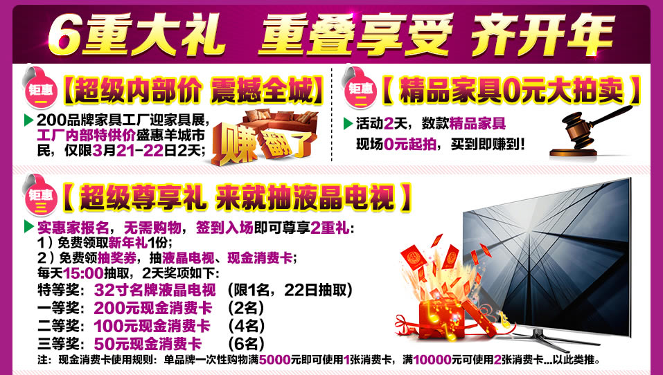 活动介绍: 春天是我们放飞的企盼,也是播撒幸福种子的好季节,然而,幸福离不开一个温暖的家,你的家装你做主。2015年3月21-22日,报名参加春季全球家具展暨羊城超级内购,200品牌家具工厂迎家具展,工厂内部特供价盛惠羊城市民.1000元现金消费卡(全场通用)不再是梦想,入场即可免费参与抽奖,赢取32寸液晶电视!满额即刻送洗衣机、微波炉、吸尘器等豪华家电!超级大乐购,快订就送品牌床垫。超级大礼包,超级大实惠,超级家具展!这一刻,等你见证您的新年好运!