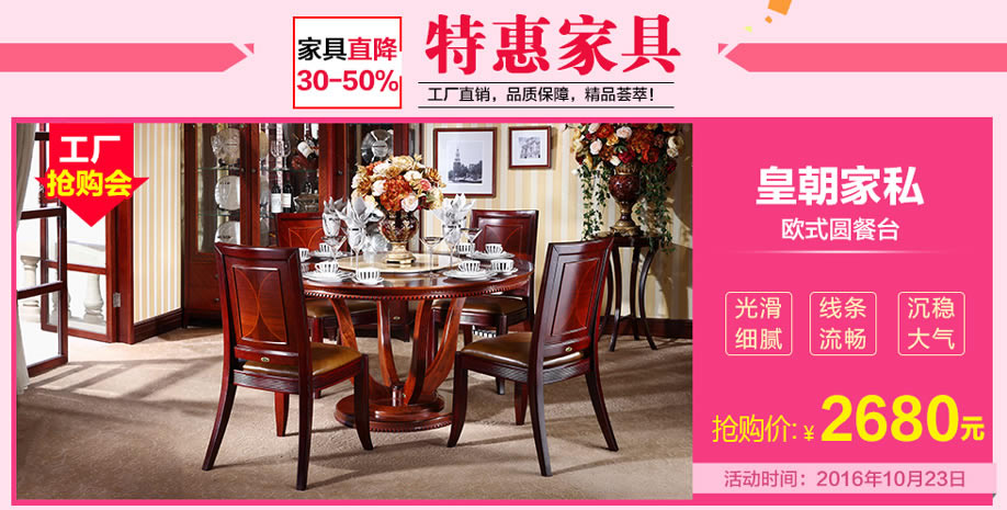 活动介绍: 10月23日皇朝家私携手实惠家举办“工厂抢购会”大型的家具促销活动。活动期间,总部工厂为迎接本次峰惠,总裁特批,工厂开仓,全场所有商品直降30-50%,全年仅此一次。活动当天,满额即送千件豪礼,买越多送越多!大单返现金2888元,更有大抽奖,奖品有:美的冰箱、皇朝织锦床垫等豪礼。好礼拿不停,价格更实惠。买到就是赚到了,赶紧来实惠家报名锁定优惠吧!