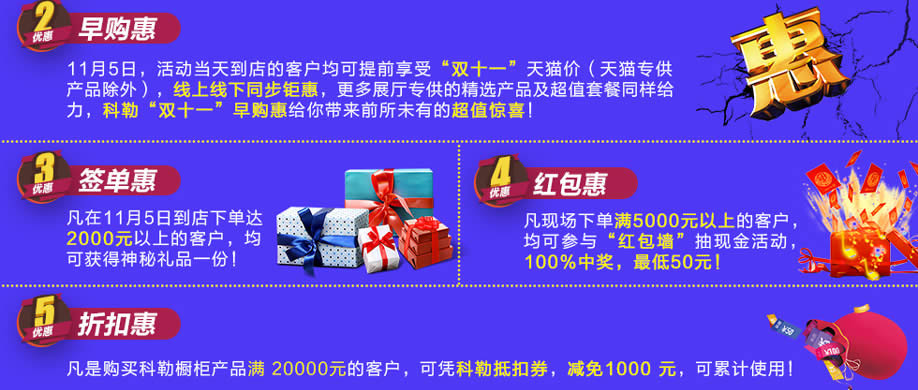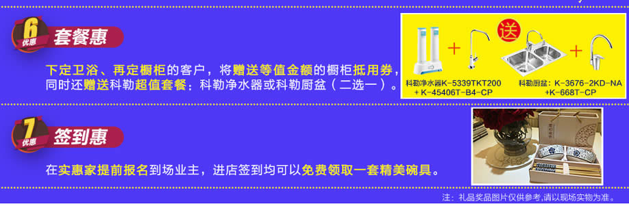 活动介绍: 11月5日科勒设计中心 半价钜惠,全场万款名牌卫浴、橱柜半价特供,爆款单品+超值套餐抢不停,底价惠民,实惠多多。活动期间,到店业主均可提前享受“双十一”天猫价,下单满额即送精彩豪礼;还可参与现金红包抽奖,100%中奖!下定卫浴、橱柜的业主,再送科勒超值套餐!多重钜惠,伴您提前过双11,仅此1天,全城最低,不要再犹豫了,赶紧在实惠家报名吧,报名到场还可免费领取精美礼品哦!!!