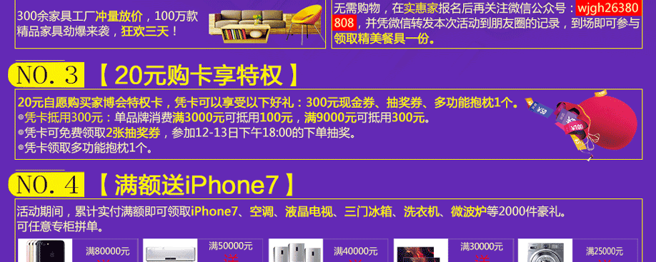 活动介绍: 11月11-13日,万江光辉“东莞家博会”狂欢3天,嗨爆全城!活动期间,1000余家具工厂冲量放价,100万款精品家具劲爆来袭,惊喜不断!全场家具价格击穿底线!家具类别齐全,涵盖了板式板木、客厅沙发、软体睡眠、红木实木、儿童、欧美等多个类别,可供您一站式购齐,让您省力省心更省钱!活动3天,4999元现金大抽奖、送全屋家电、再送品牌床垫、更有iPhone7等豪礼等你带回家!精彩限此3天,赶紧在实惠家报名,锁定活动优惠折扣!