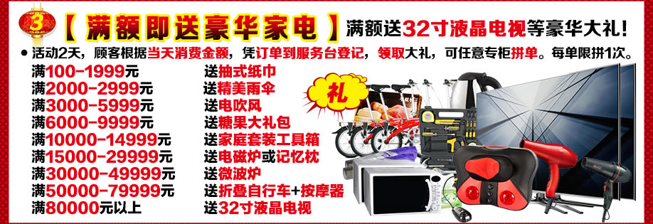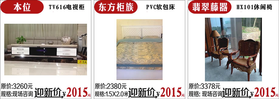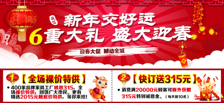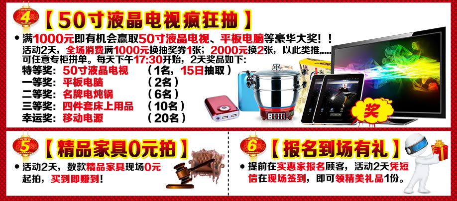 活动介绍: 3月14-15日红树湾家具博览中心为各会员送上新春第一大礼!报名就送礼!买家具送豪礼:32寸液晶电视、折叠自行车+按摩器、微波炉等!满额再抽50寸液晶电视、平板电脑、名牌电炖锅等!多重礼品重叠享受!更有多款触底价2015元精选家具等你来抢! 3月14-15日诚信3.15 家具裸价盛典,红树湾中山大道东总店和荔湾店两馆联动,迎春大促,福满羊年!中山大道东总店家具裸价盛典,将最惠的家具带给您;最大的福利送给您,最好的祝福递给您!赶紧报名实惠家,领取新春大礼吧!