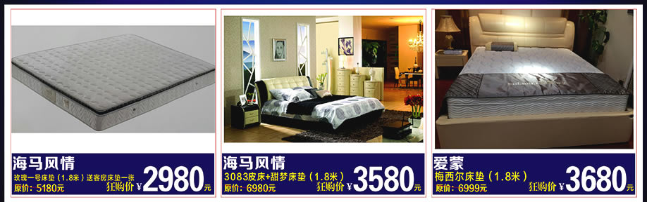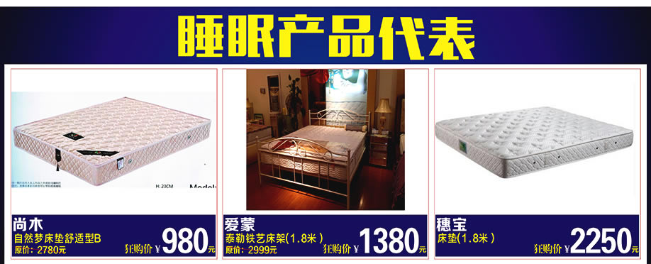 睡眠用品:爱蒙、雅兰床垫、穗宝、海马风情、卡路福、自然梦棕垫