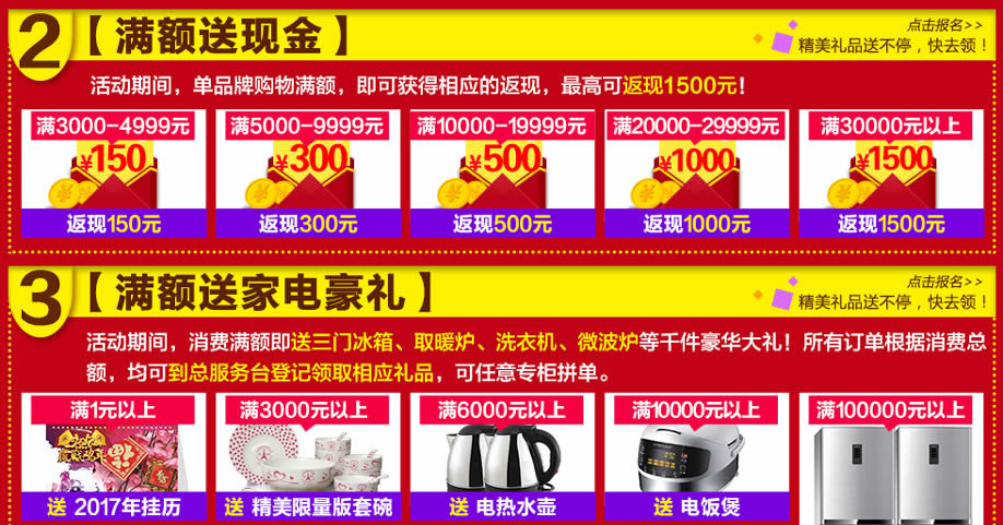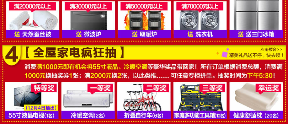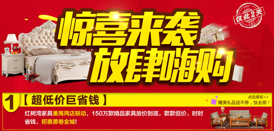活动介绍: 12月3-4日,红树湾家具番禺两店联手实惠家,举办“家具超级放价日”大型促销活动!钜惠风暴,礼袭全城!150万款精品家具放价到底,引领低价风暴!消费满额即送现金,最高返现1500元;满额即送三门冰箱、取暖炉、洗衣机、微波炉、电饭煲、天然蚕丝被等千件豪华大礼!还可参与大抽奖,55寸液晶、冷暖空调等好礼永不落空!活动两天,红树湾家具番禺总店,以真诚好礼,优质服务,高质产品,超低价格,迎接您的到来!赶紧在实惠家报名参与吧!