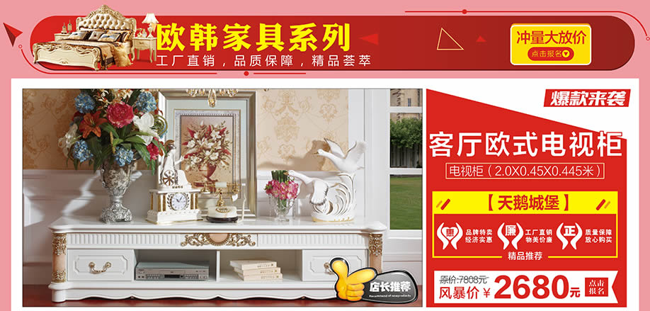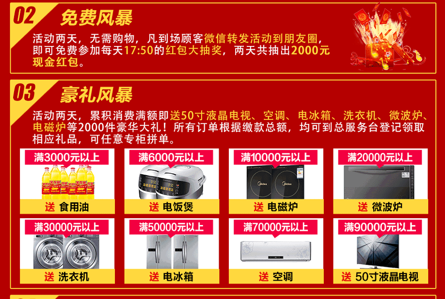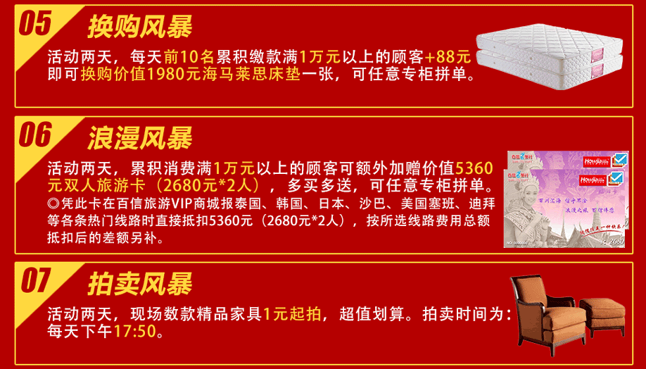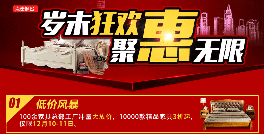 活动介绍: 12月10-11日,皇家1号家居举办以“年终风暴 逆袭价临”为主题的大型促销活动,岁末狂欢,聚"惠"无限!活动期间,100余家具总部工厂冲量大放价,10000款精品家具3折起,将价格优惠到底!活动2天,2000元现金红包来就送!满额即送50寸液晶、空调等2000件豪华大礼!更有4999元大免单、金条等千件豪华大奖等你来拿!下单再送价值5360元双人旅游卡!活动仅限12月10-11日,不容错过!火速报名参与到活动当中来吧!