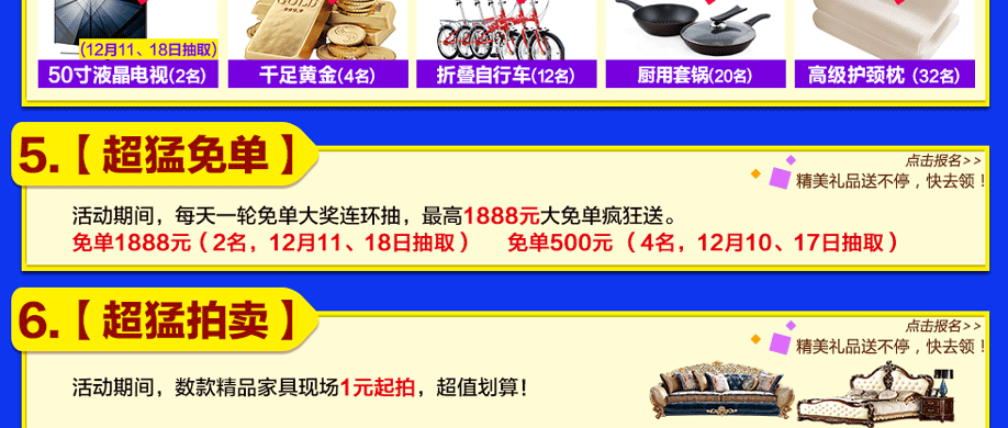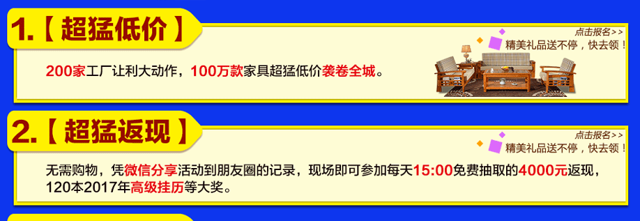 活动介绍: 没有大动作,哪敢惊动您?12月10-11/17-18日,红树湾家具中山大道东店“家具超猛一战 势不可挡”狂销4天!200家工厂让利大动作,100万款家具超猛低价袭卷全城。活动期间,嗨翻全城:微信分享活动,即可免费参加4000元返现抽奖!礼惠全城:满就送2000件电冰箱、洗衣机等家电好礼!绽放全城:下单赢50寸液晶、千足金!更有高达1888元免单大奖等着你!12月10-11/17-18日,我们一战到底!赶紧在好家网报名,锁定福利优惠吧!