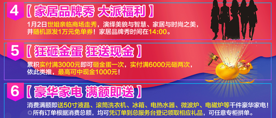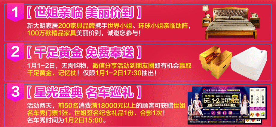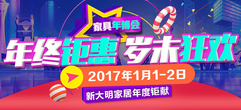 活动介绍: 撕掉日历最后一张,新的一年开始了!2017年1月1-2日新大明家居年度钜献,特联手好家网举办家具年博会!活动期间,100万款精品家具美丽价到,狂销直减,让利到底!千足黄金,免费奉送;星光盛典,名车巡礼;万元免单,随机派发;现场砸金蛋中现金,最高可中1000元;消费满额,再送50寸液晶电视;另有4999元团年饭礼金疯狂抽;更有1元拍卖、异国之旅等10重钜惠,精彩绽放!无需犹豫,赶紧报名参加吧!
