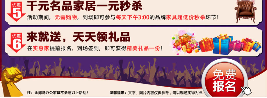 特别提示:应举办方规定,实惠家是本次活动指定报名登记渠道,所有参与业主须在本页面(上方左侧或下方图标)报名,报名登记成功方可享受活动的所有优惠环节,活动前会有客服致电告之详情。如对报名成功与否有疑问,可致电020-32038939查询→。