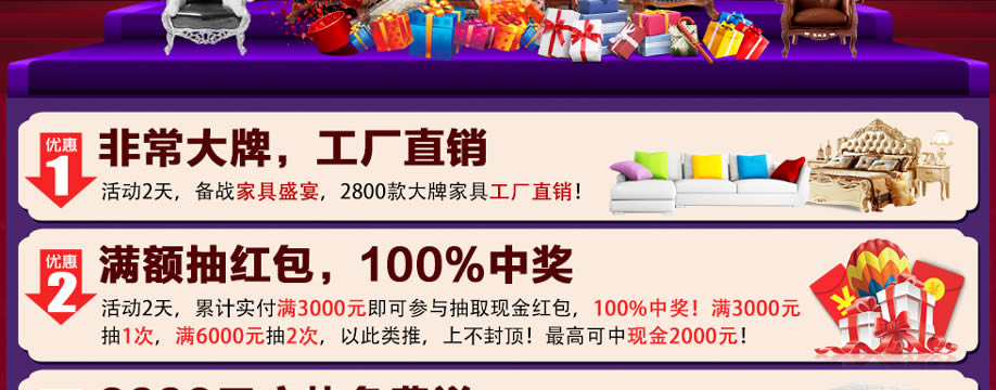 活动介绍: 疯狂钜惠席卷全城!千份见面礼任性送,千元名品家具超低价秒杀,满额即有机会抽2000元现金红包,3999元床垫买满即送,4999元免单大奖疯狂抽!2月25-26日以“家具直销大典”为主题的大型促销活动将在芳村金海马家具博览中心举行。活动2天,备战家具盛宴,2800款大牌家具工厂直销,给你意想不到的最低价!赶紧在实惠家报名,锁定本次所有优惠环节吧!