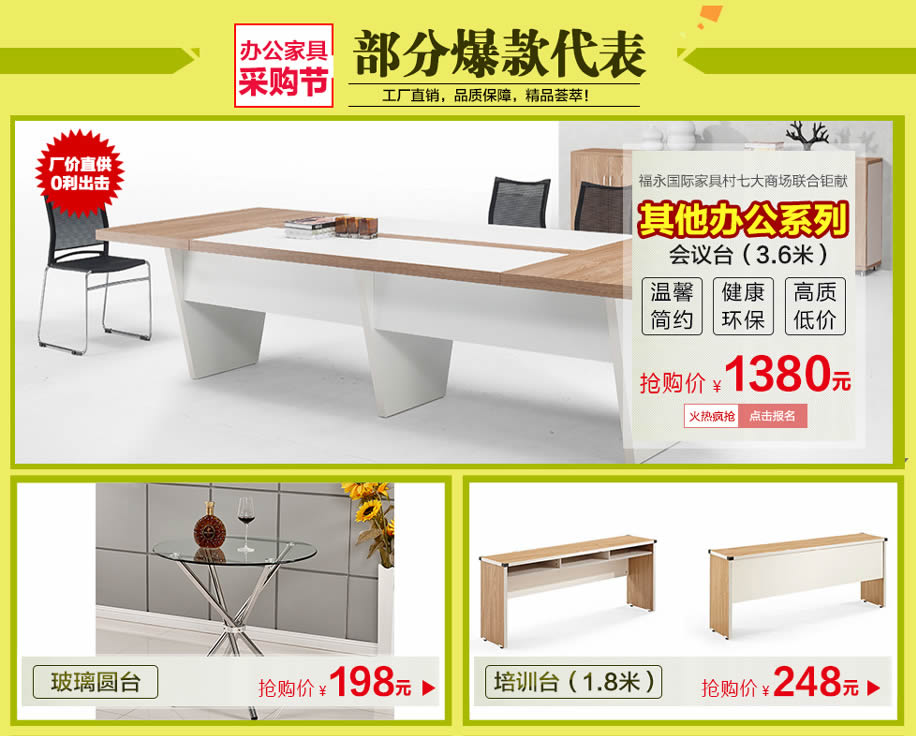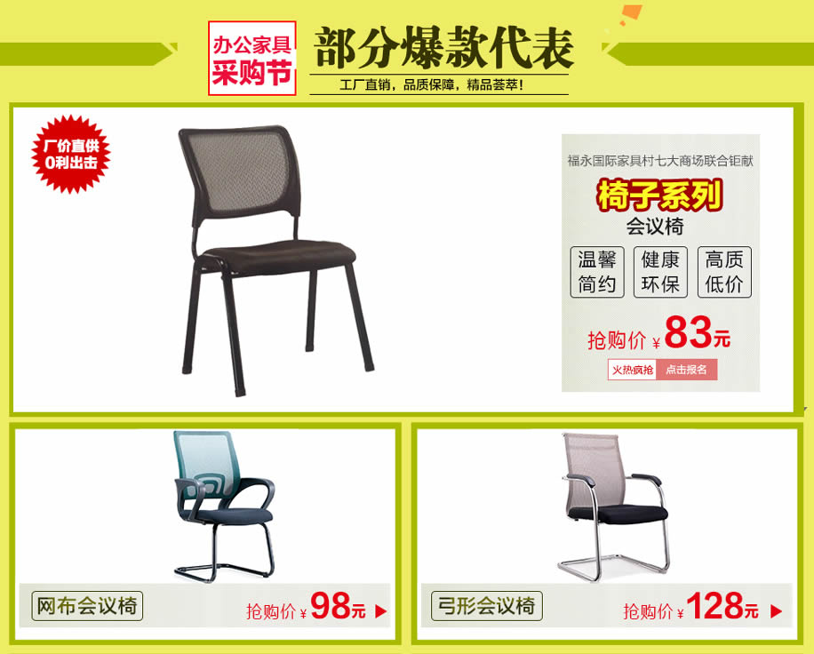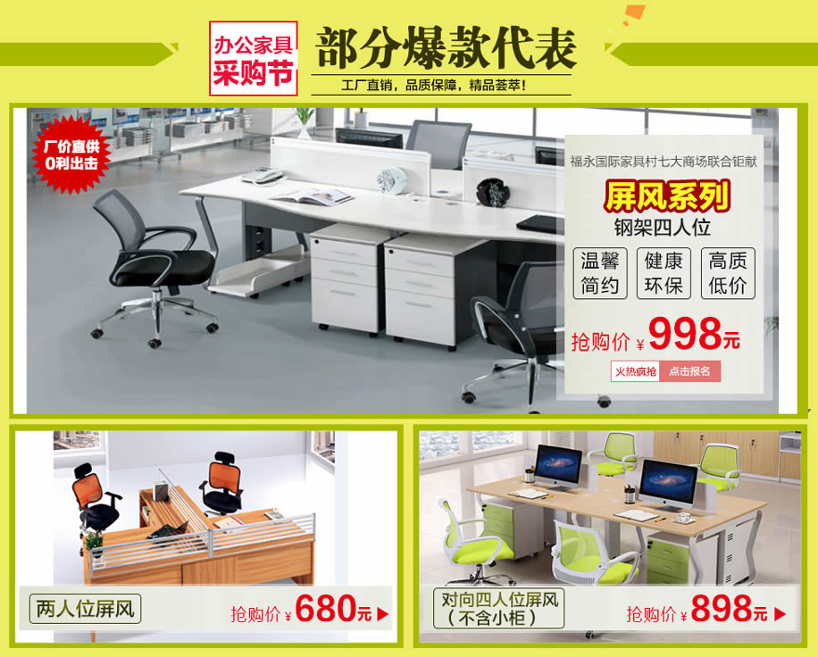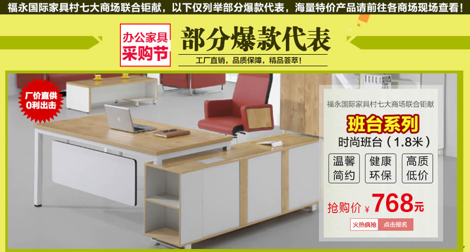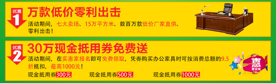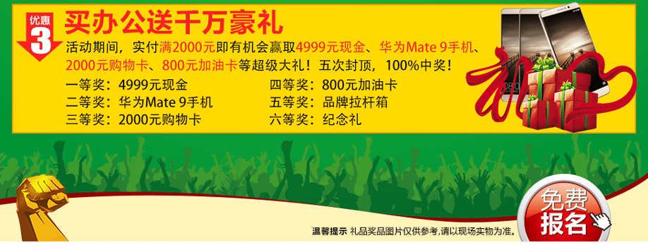活动介绍: 好的办公家具营造好的工作环境,有一个充满生机和高效率的现代办公环境空间,才得以使公司员工淋漓尽致的发挥潜能,使公司完美的形象得以展示升华。2月20日-3月3日,第三届春季宝安•福永办公家具采购节盛大开幕,七大卖场、15万平方米、数百万款低价厂家直供、零利出击!活动12天,30万现金抵用券免费送,狂抽4999元现金、华为Mate 9手机等豪华大礼!购物下单即享多重钜惠!马上在实惠家报名,参加我们的活动吧!