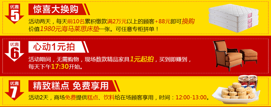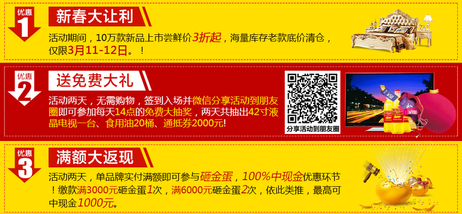 活动介绍: 皇家一号布吉店联手实惠家举办“新春大惠 家具狂销盛典”大型促销活动。10万款新品上市尝鲜价3折起,海量库存老款底价清仓,就在3月11-12日2天。活动期间,业主到场签到即可有机会抽取42寸液晶电视;全场家具低至3折起;购物满额畅享砸金蛋返现好礼,最高可中1000元;家电大抽奖,50寸液晶、家庭影院、空调、冰箱、智能扫地机器人等家电豪礼永不落空;更有88元换购品牌床垫;精品家具1元起拍,惊喜不断!赶紧在实惠家报名,锁定本次活动优惠,尽享业主礼遇吧!