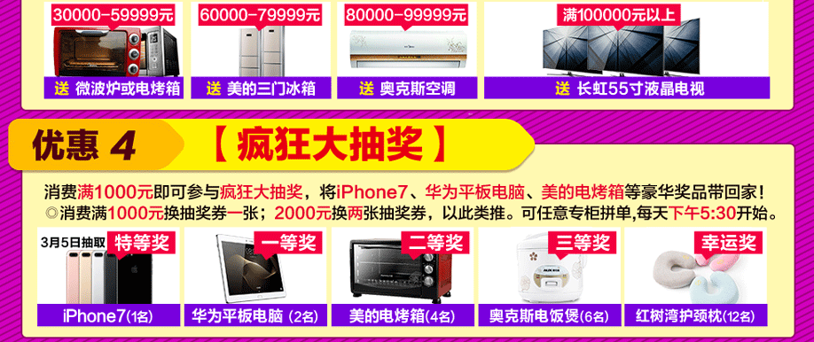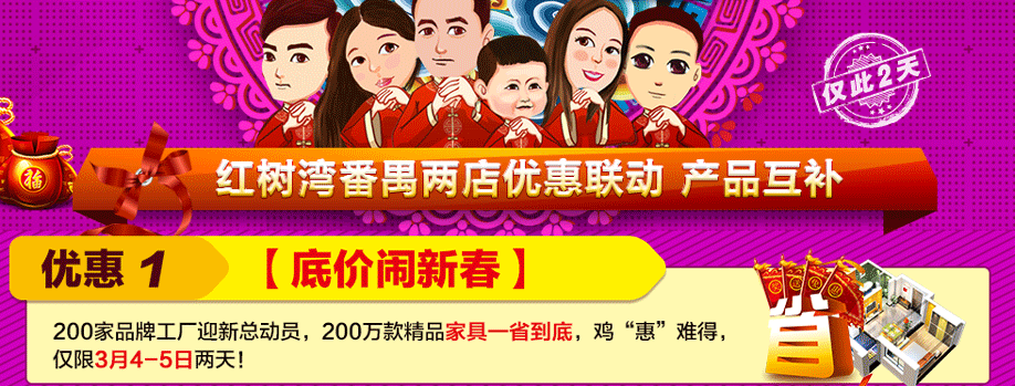 活动介绍: 3月4-5日,红树湾家具番禺两店联手好家网举办“家具闹新春 鸡‘惠’难得”大型促销活动!钜惠风暴,礼袭全城!本次活动,200工厂迎新总动员,200万款家具一省到底!活动期间,您来购物即可畅享家具最底价!购物满额即送浪漫旅游,还有超级大抽奖等着您,将新版苹果手机、55寸液晶电视、冰箱等豪礼通通带回家!红树湾番禺总店,以真诚好礼,优质服务,高质产品,超低价格,迎接您的到实惠家报名参与吧!