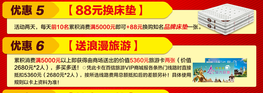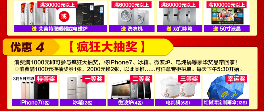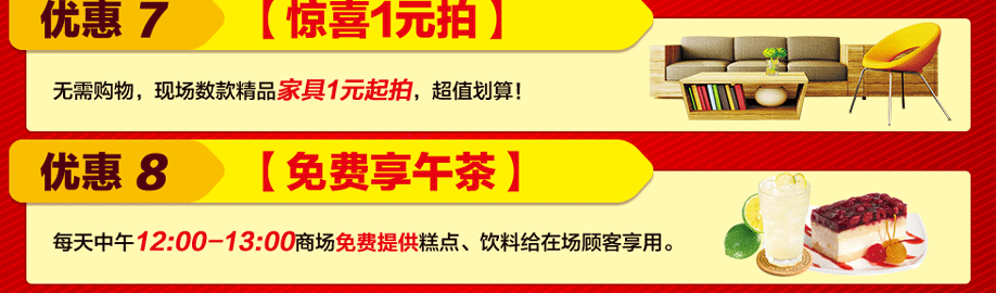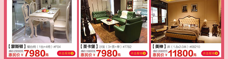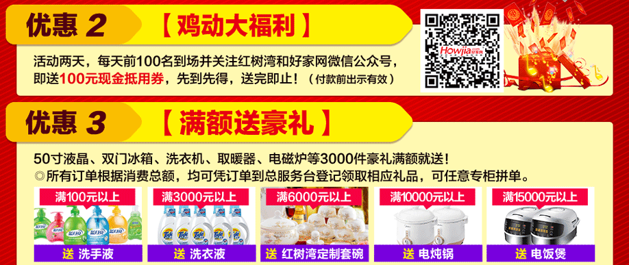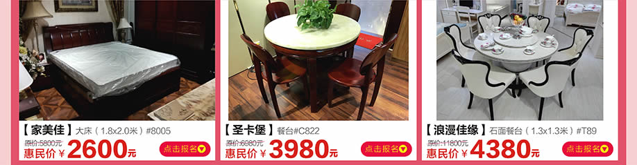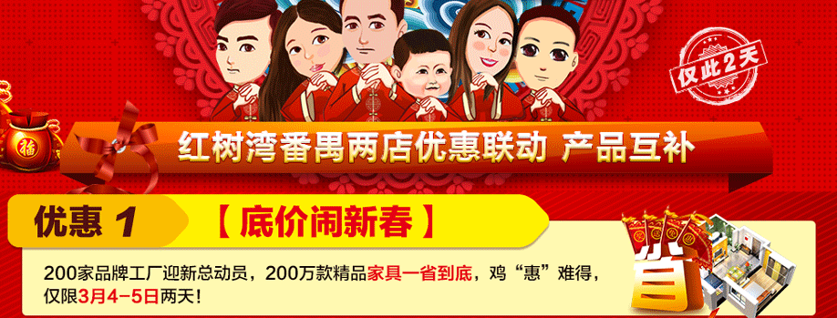 活动介绍: 3月4-5日,红树湾家具番禺两店联手好家网举办“家具闹新春 鸡‘惠’难得”大型促销活动!钜惠风暴,礼袭全城!本次活动,200工厂迎新总动员,200万款家具一省到底!活动期间,您来购物即可畅享家具最底价!购物满额即送浪漫旅游,还有超级大抽奖等着您,将新版苹果手机、50寸液晶电视、冰箱等豪礼通通带回家!红树湾番禺大道店,以真诚好礼,优质服务,高质产品,超低价格,迎接您的到来!赶紧在实惠家报名参与吧!