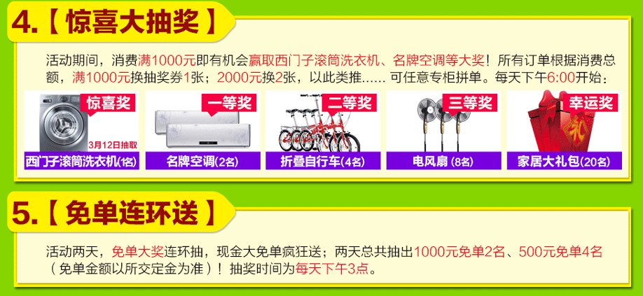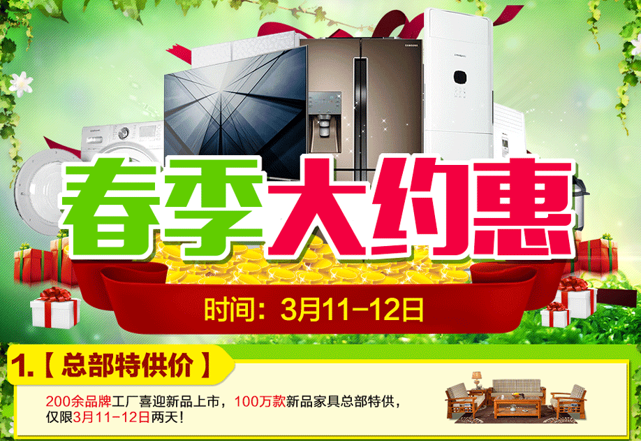 活动介绍: 3月11-12日红树湾中山大道东店 家具春博惠!惠利满全城!豪礼来相送!200余品牌工厂喜迎新品上市!100万款新品家具总部特供!钜惠狂飙,拼尽全利,就是你疯狂!大派福利:来就免费抽豪礼!还有免单大奖连环抽,最高可免1000元!超级大礼:满额即送50寸液晶!重磅大戏:再抽全屋家电等豪礼!多重豪礼聚惠全城!你还有什么理由不来!快火速报名参加活动吧!来将满意的家具挑回家!来将豪华大礼统统赢回家吧!