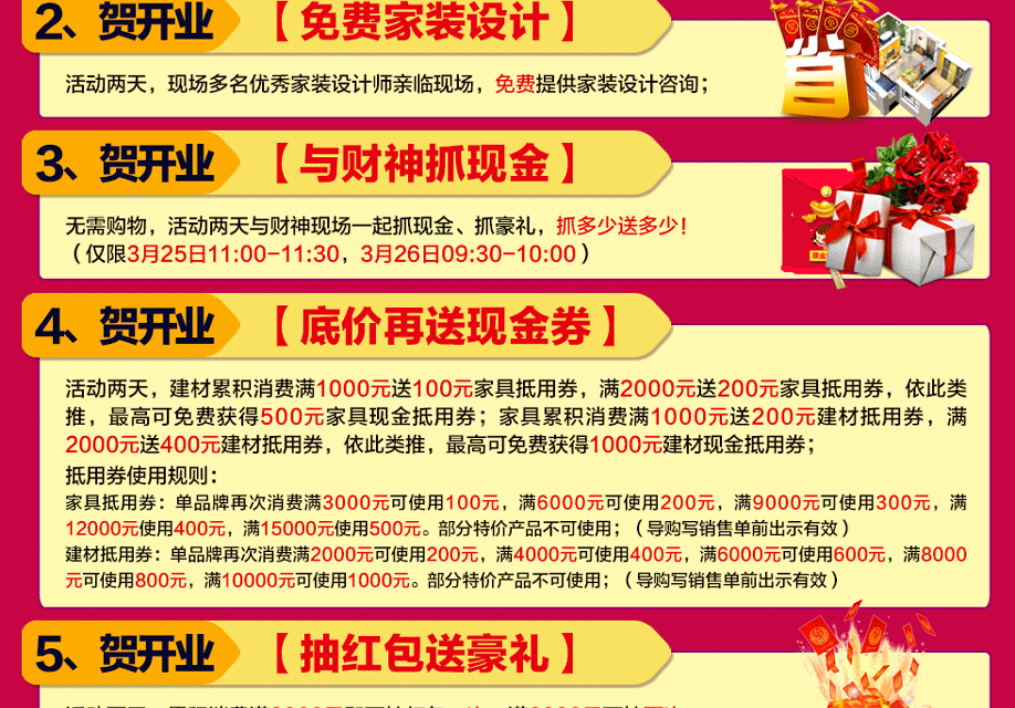 活动介绍: 3月25-26日红树湾家具番禺总店建材馆,盛大开业!建材馆隆重开业,建材、家具齐开放!精品汇萃,品种齐全,建材、家具一网打尽!为您的家提供适宜的建材!为您的爱巢填满心仪的家具!活动期间,您来购物即可畅享家具最底价,建材馆产品3折起!贺开业:抓现金、抓豪礼,还有现金抵用券!另有iPhone7、黄金、免单等大奖疯狂抽!还有免费领建材券、家居1元秒杀等大惠利!红树湾番禺总店,隆重邀您赴约!赶紧在实惠家报名参与吧!