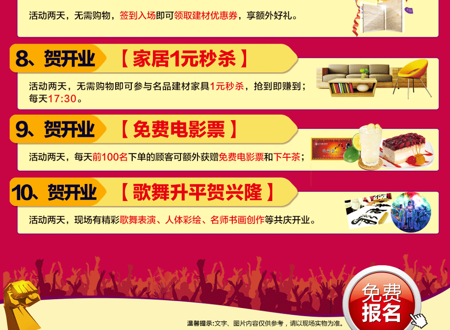特别提示:应举办方规定,实惠家是本次活动指定报名登记渠道,所有参与业主须在本页面(上方左侧或下方图标)报名,报名登记成功方可享受活动的所有优惠环节,活动前会有客服致电告之详情。如对报名成功与否有疑问,可致电020-32038939查询→。