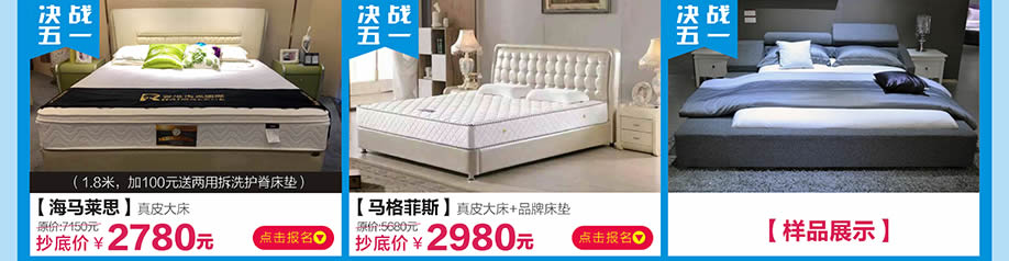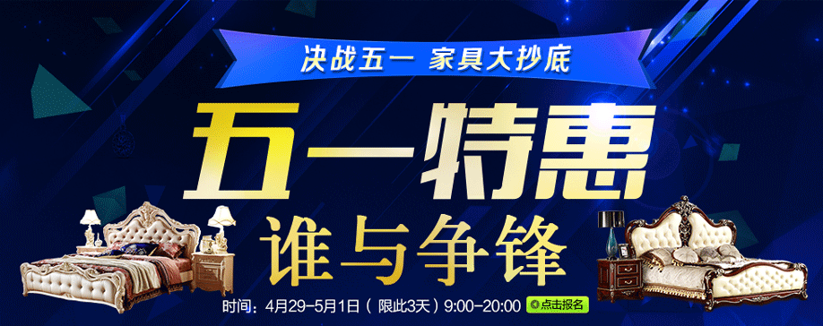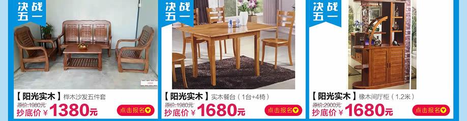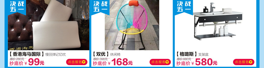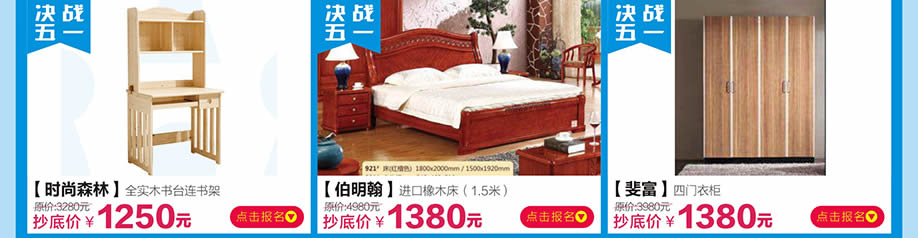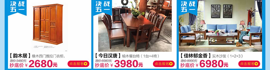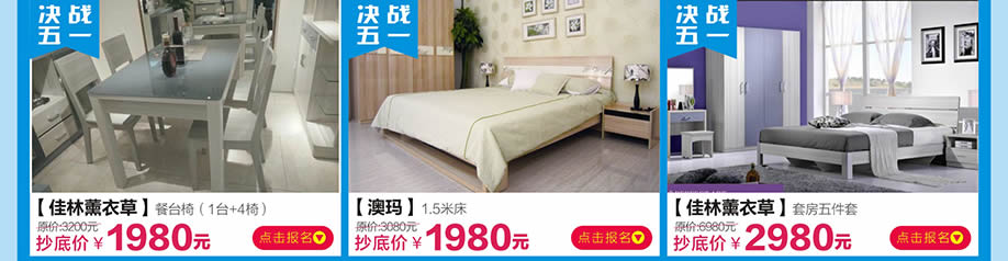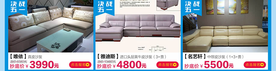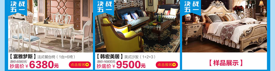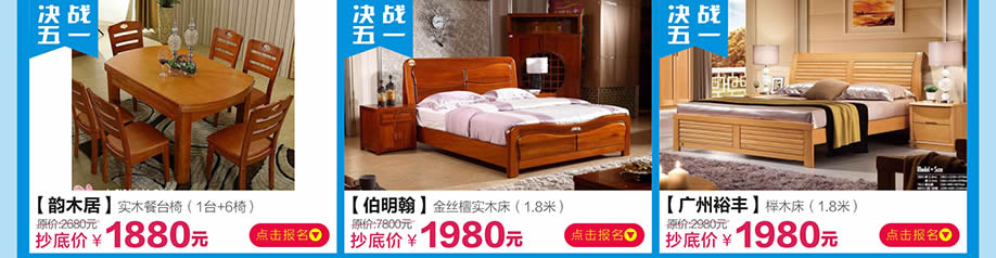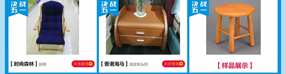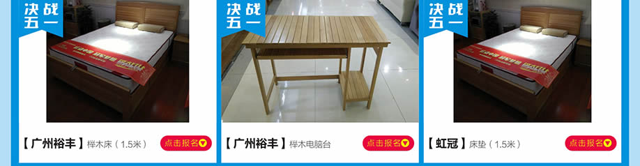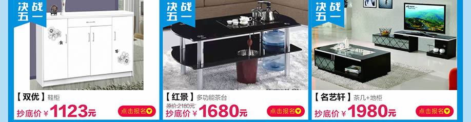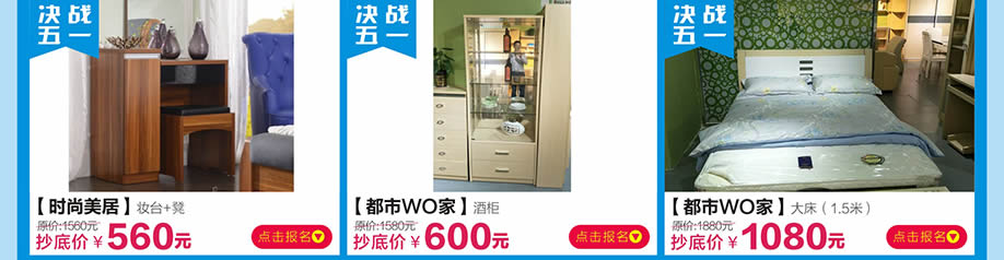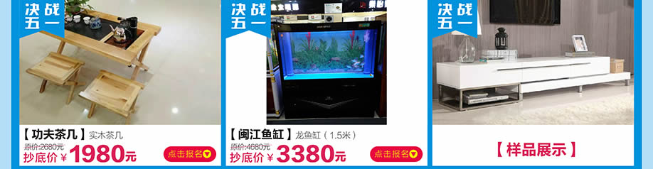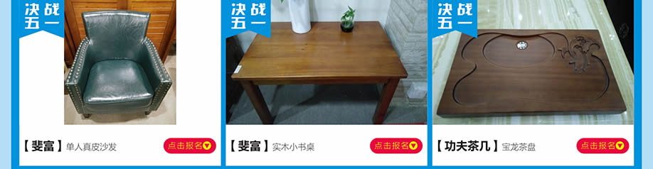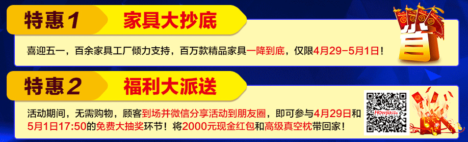 活动介绍: 五一特惠,谁与争锋!4月29-5月1日方兴利家具广场联手实惠家隆重举办【决战五一 家具大抄底】活动。喜迎五一,百余家具工厂倾力支持,百万款精品家具一降到底,仅限4月29-5月1日!活动期间,优惠多多,豪礼送不停:无需购物即有机会将2000元现金红包带回家!满额即送48寸液晶电视、空调等家电豪礼!还有有机会赢取50寸液晶电视!现场更有沙发、乳胶枕、电视柜等精品0元起拍!快抓住机会,马上在实惠家报名参加活动吧!
