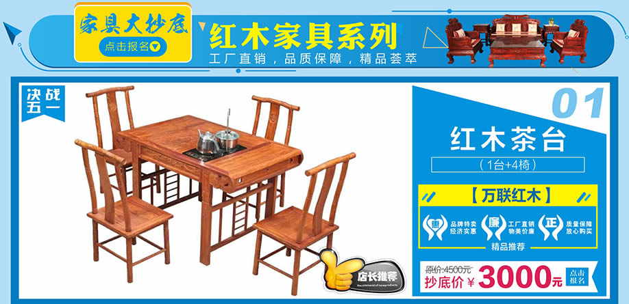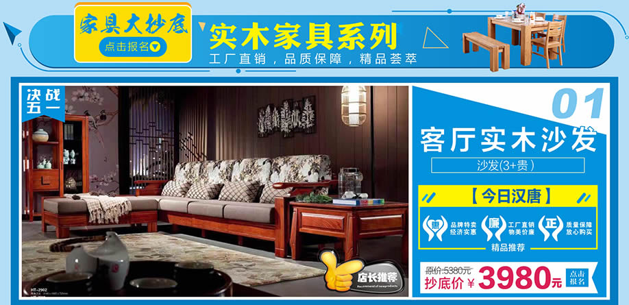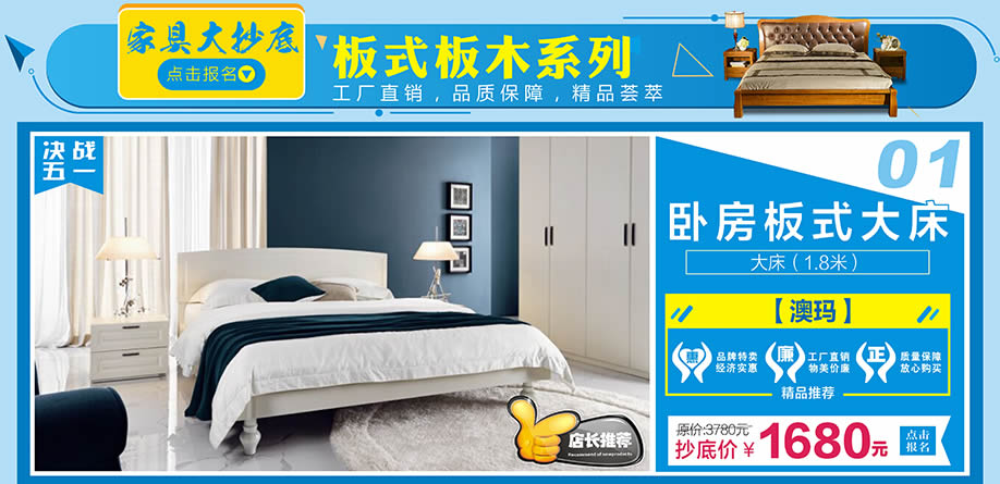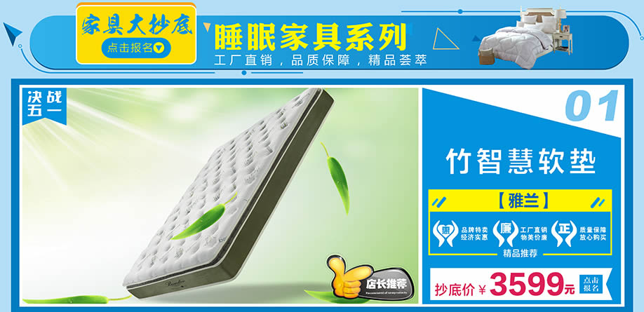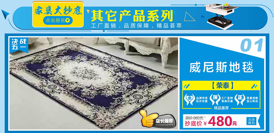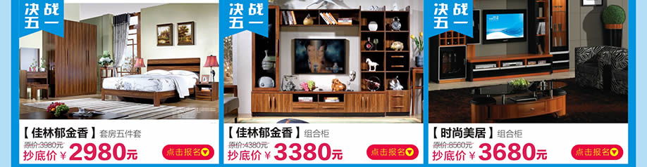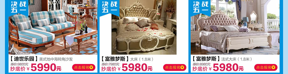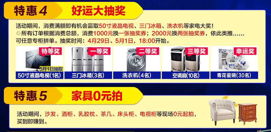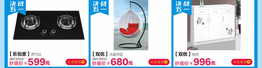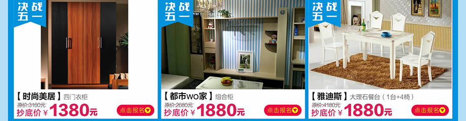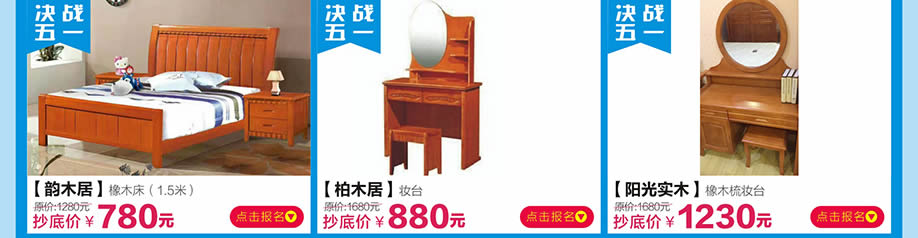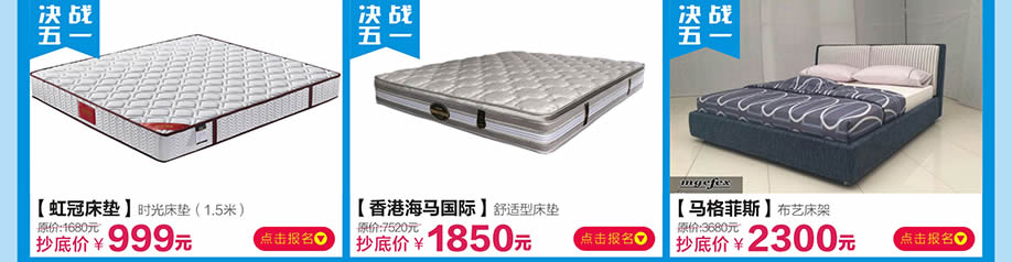 活动介绍: 五一特惠,谁与争锋!4月29-5月1日方兴利家具广场联手实惠家隆重举办【决战五一 家具大抄底】活动。喜迎五一,百余家具工厂倾力支持,百万款精品家具一降到底,仅限4月29-5月1日!活动期间,优惠多多,豪礼送不停:无需购物即有机会将2000元现金红包带回家!满额即送48寸液晶电视、空调等家电豪礼!还有有机会赢取50寸液晶电视!现场更有沙发、乳胶枕、电视柜等精品0元起拍!快抓住机会,马上在实惠家报名参加活动吧!