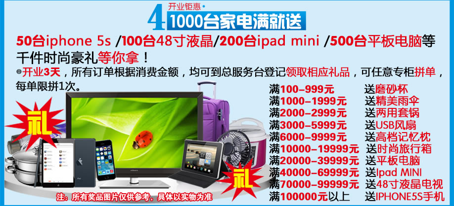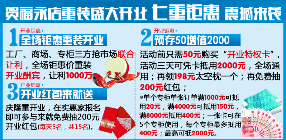 活动介绍: 老字号专业家居连锁商场光辉家居(仅限福永店)品牌升级重新装修,9月6-8日盛大开业,1000万让利引爆全城。家具种类齐全,板式板木、实木、儿童、软体、客厅、欧美、红木、办公等家具一站式购齐!活动3天,全场开业钜惠,工厂、商场、专柜三方联合让利,预存50=2000元+太空枕+免费现金红包!满额就送iphone5s/液晶电视/ipad mini/平板电脑等,还有48寸液晶、空调、平板电脑、对流扇等大奖等你拿!本次活动优惠空前,凭实惠家报名短信来就领精美磨砂杯+免费抽开业红包!还有免费车接送+精品家具现场0元起抢购,抢到即赚到。诚邀广大业主火速报名参与抢购!